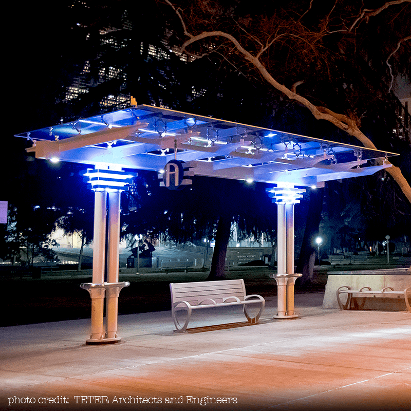 Signature Custom shelters fabricated in four sizes from 14-ft to 27-ft long. Each includes distinct branding elements highlighted by colorfully tinted polycarbonate roof panels in a “papel picado” theme to create a Sense of Place™ tying into the heritage and culture of the unique neighborhoods in which each shelter resides. The shelters also include comfortable seating and security lighting that doubles as decorative up lighting provided by energy saving, dusk-to-dawn solar powered LED illumination from valued Tolar partner, Urban Solar.