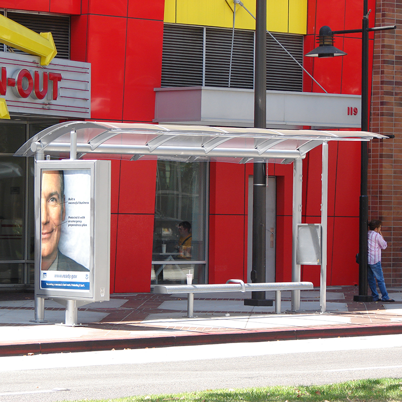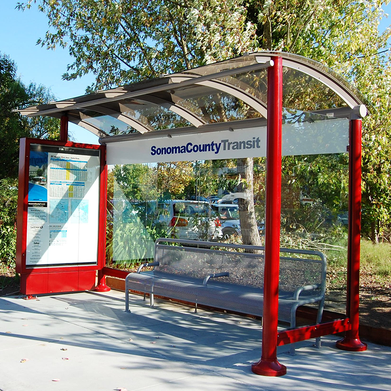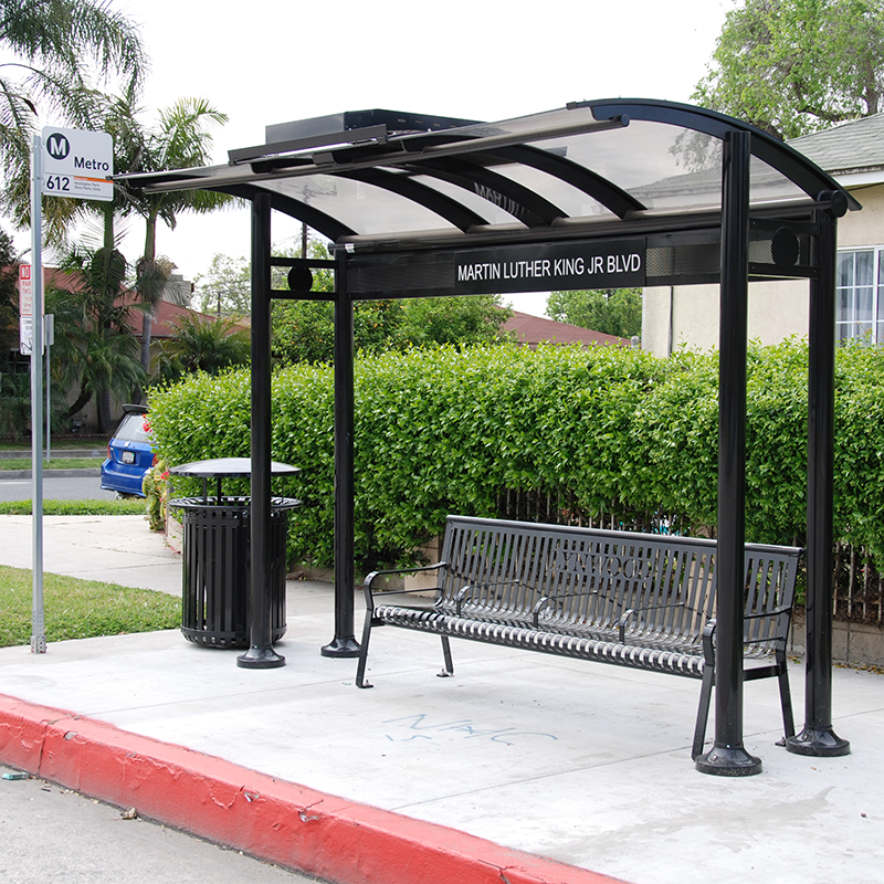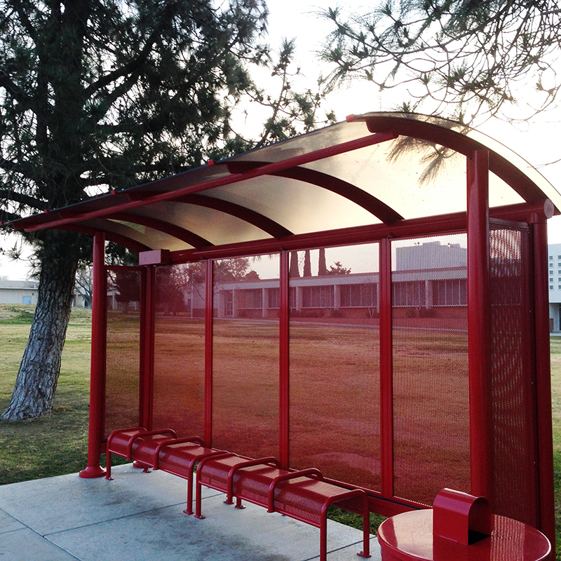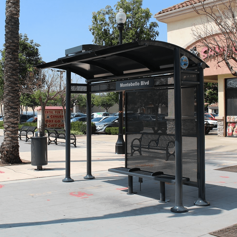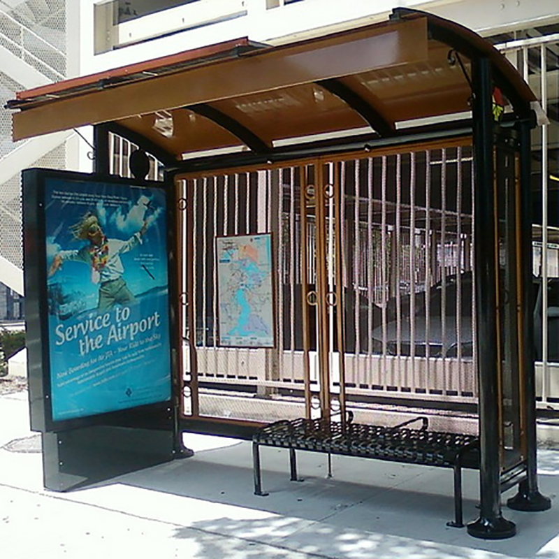 This 9-ft Signature Sunset bus shelter in Ft. Worth, Texas offers revenue-generating advertising on the end wall. t features a radius roof design with a nominal 9-ft by 5-ft roof dripline along a fully welded roof structure. 80W roof mounted solar panels with integrated battery storage, power the RMS80F Solar Lighting System which provides under roof security lighting with 5 day minimum autonomous operation through an 8W LED light fixture. A matching roof and footprint attachment are on both end walls for future ad kiosk retrofit. All parts are finished in super durable baked powder coat color as selected from TCI standard RAL color deck.