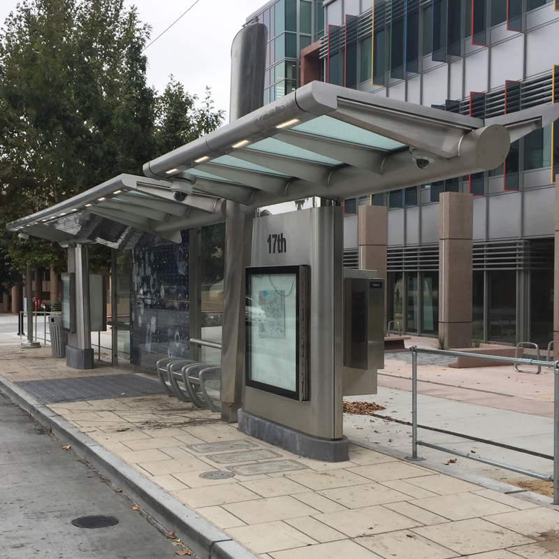 This 17-ft Sunset bus shelter provides 86 inches of digital advertising space via a display on its end wall. The bus shelter is supported by aluminum support posts protected by spun escutcheon shoe covers. Ther perforated aluminum rear and end wall showcase agency branded graphics and an end wall provides a map case lit with 110v LED. Roof lighting offers passenger security while Mesa-style seating provides passenger comfort. Waste and recycle receptacles round out the bus stop.
