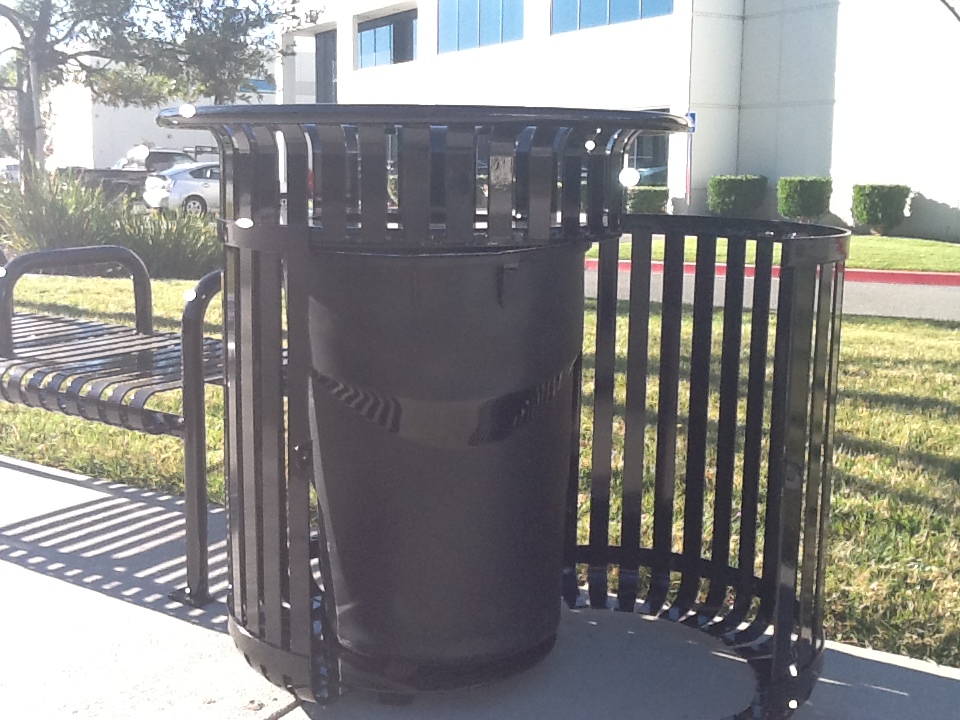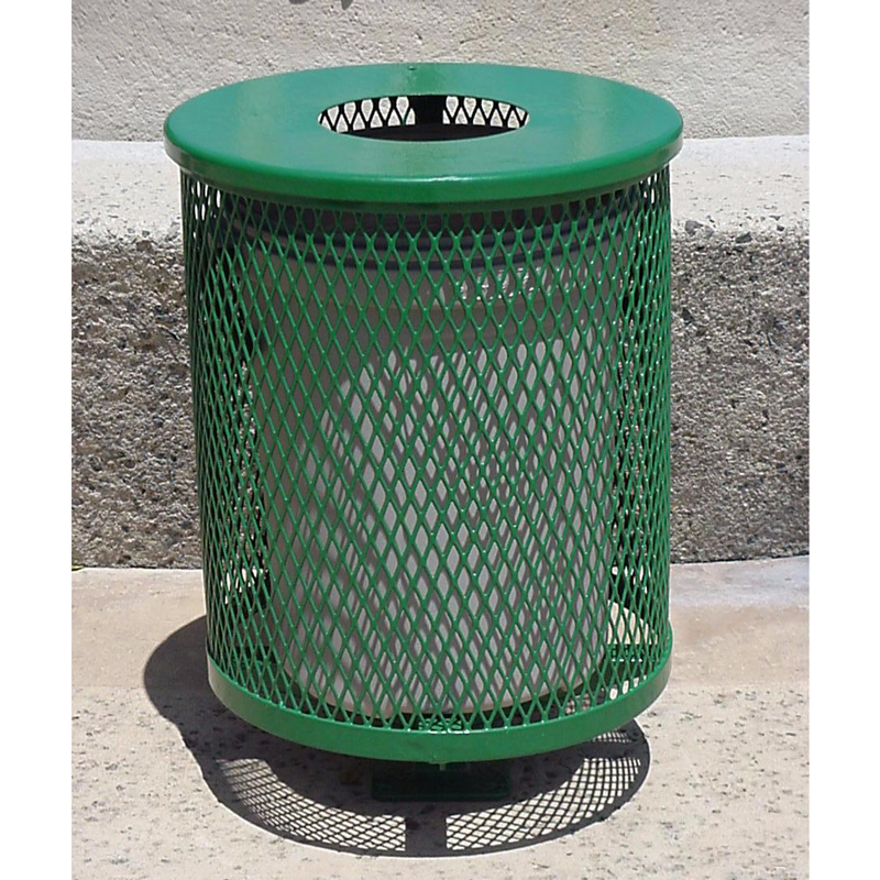 32 gallon square perforated metal trash receptacle with radius dome lid and hard rubber liner. Includes hinged door for ease of liner removal.