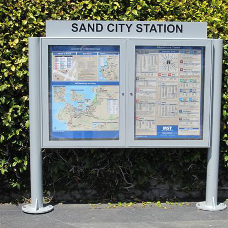 Three-sided information kiosk with peak top and hinged doors on all sides.