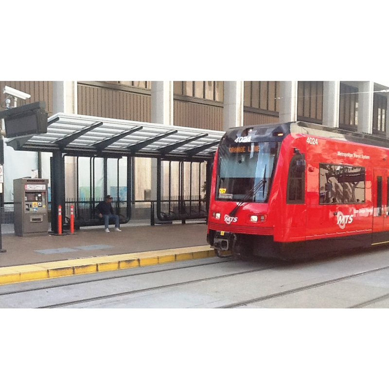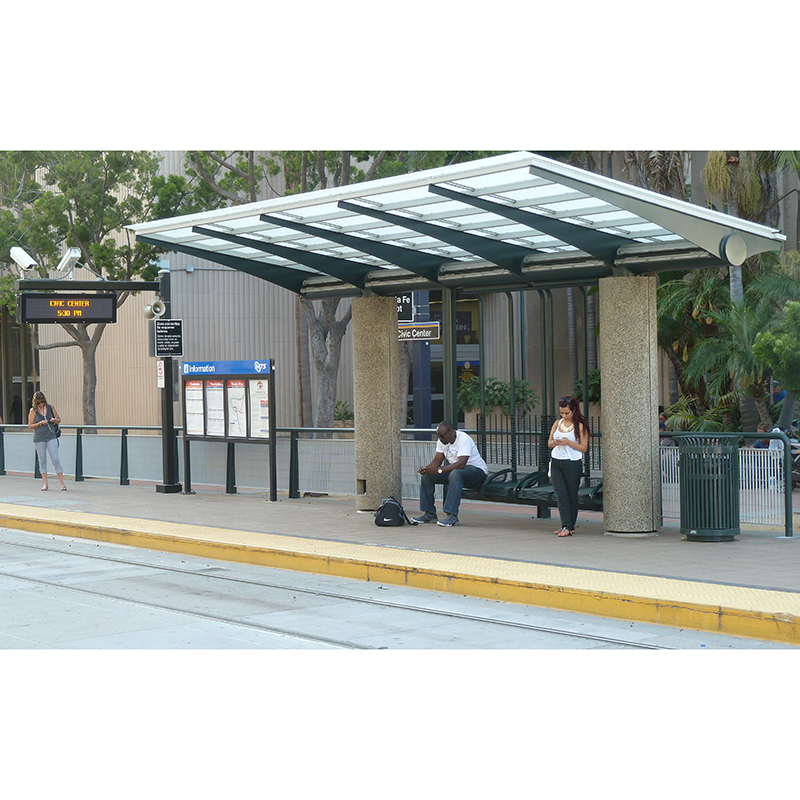 Tolar Custom Trolley Shelters in San Diego (CA) featuring all steel construction, custom roof panels, custom lighting, concrete post cladding.