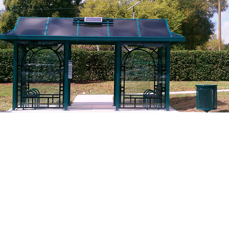 16′ Niagara non-ad palladium roof transit shelter with bronze Lexan roof panels, 3/8″ Victorian style tempered frit glass, integrated map case, recycle slat bench with back, seat-delineators, and solar lighting.