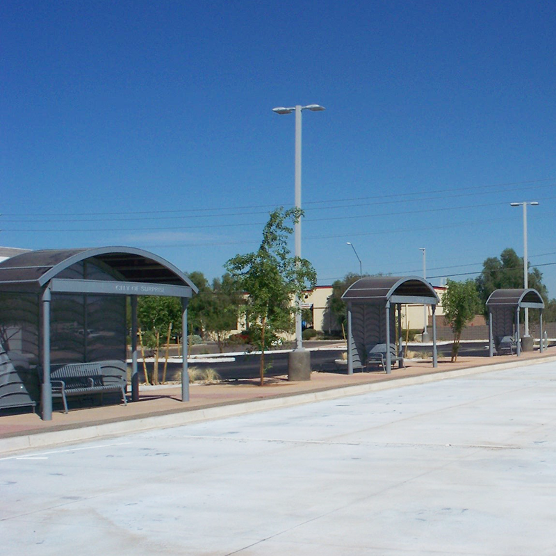 Signature Custom 16-ft transit shelter with radius roof, bronze Lexan panels, custom back lit city marquee, custom perforated metal rear wall, decorative mounting shoe covers, and 6-ft steel strap bench with back and seat delineators.
