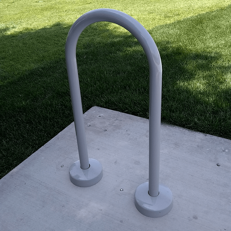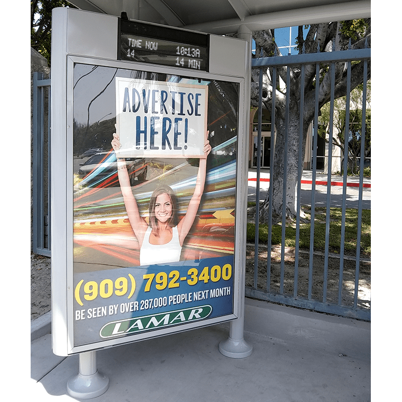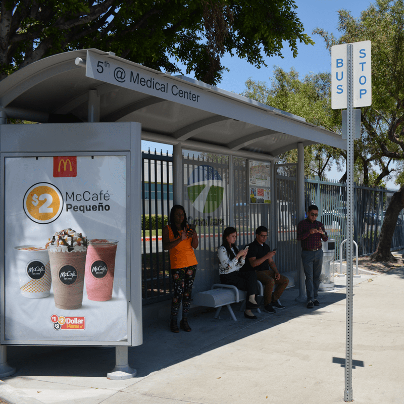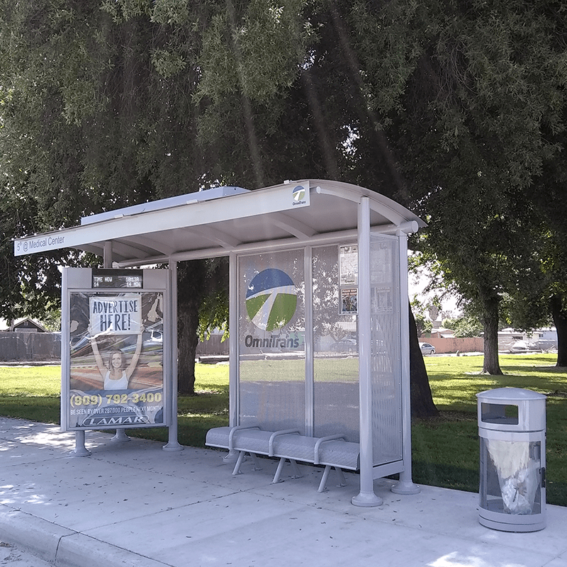 Signature Custom SmartPlace™ 17-ft advertising transit shelter with custom radius roof that incorporates solar power into the roof. Two-door media display kiosk includes two-line, low-draw, real-time passenger information. The perforated metal rear wall displays the agency logo directly on the metal perforation and an information/map display. Other amenities include stop location banner on the roof line, 7-ft perforated metal bench with angled supports, a bike loop with spun escutcheon cover for bicycle security and 35 gallon DHS-approved trash receptacle.