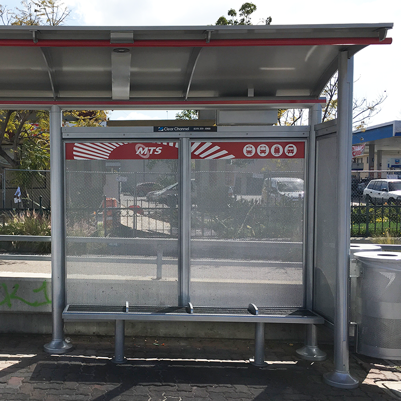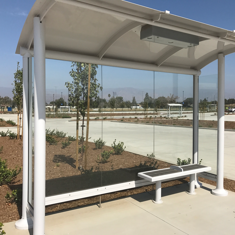 This 9-ft Signature Sunset bus shelter in Ft. Worth, Texas offers revenue-generating advertising on the end wall. t features a radius roof design with a nominal 9-ft by 5-ft roof dripline along a fully welded roof structure. 80W roof mounted solar panels with integrated battery storage, power the RMS80F Solar Lighting System which provides under roof security lighting with 5 day minimum autonomous operation through an 8W LED light fixture. A matching roof and footprint attachment are on both end walls for future ad kiosk retrofit. All parts are finished in super durable baked powder coat color as selected from TCI standard RAL color deck.
