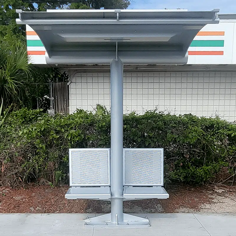 This Signature Sunset EcoShade Monopole Transit Shelter in St. Petersburg, Florida features a Sunset radius roof design with a 6-ft x 6-ft roof dripline, all aluminum construction, and fully welded roof structure. A RMS80F Solar Lighting System is integrated into the shelter roof structure providing automatic dusk-to-dawn security lighting under the bus shelter roof. Two fully welded bus bench seats with backrests are mounted on both sides of the center column providing seating at smaller bus stops. This bus shelter is in full compliance with FDOT bus stop standards.