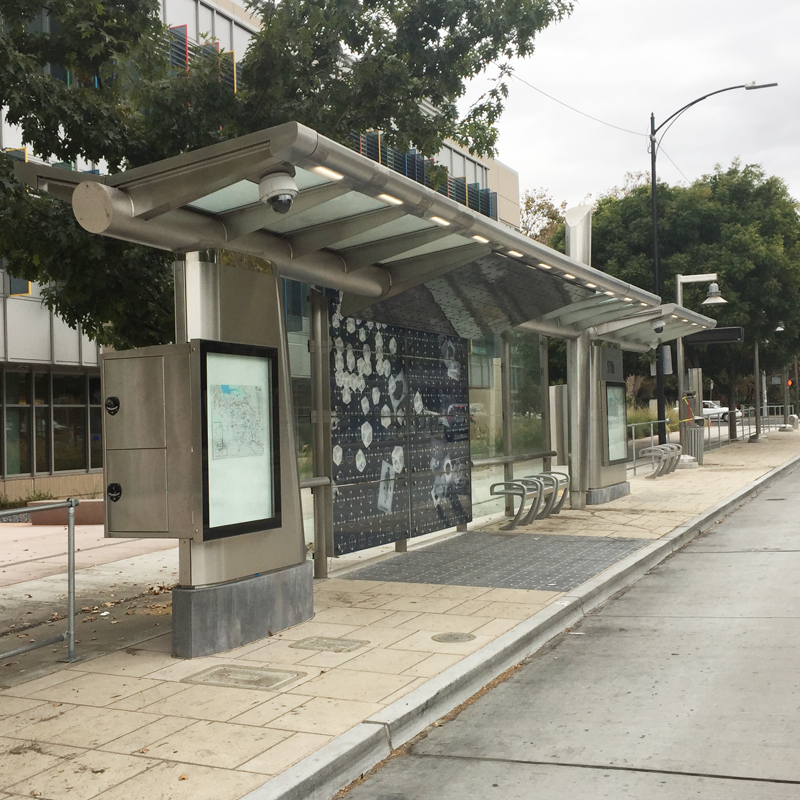 48’ Signature BRT stainless steel SmartPlace™ transit shelter for VTA in San Jose (CA) including equipment display cabinets, glass roof, art elements and protective railings.