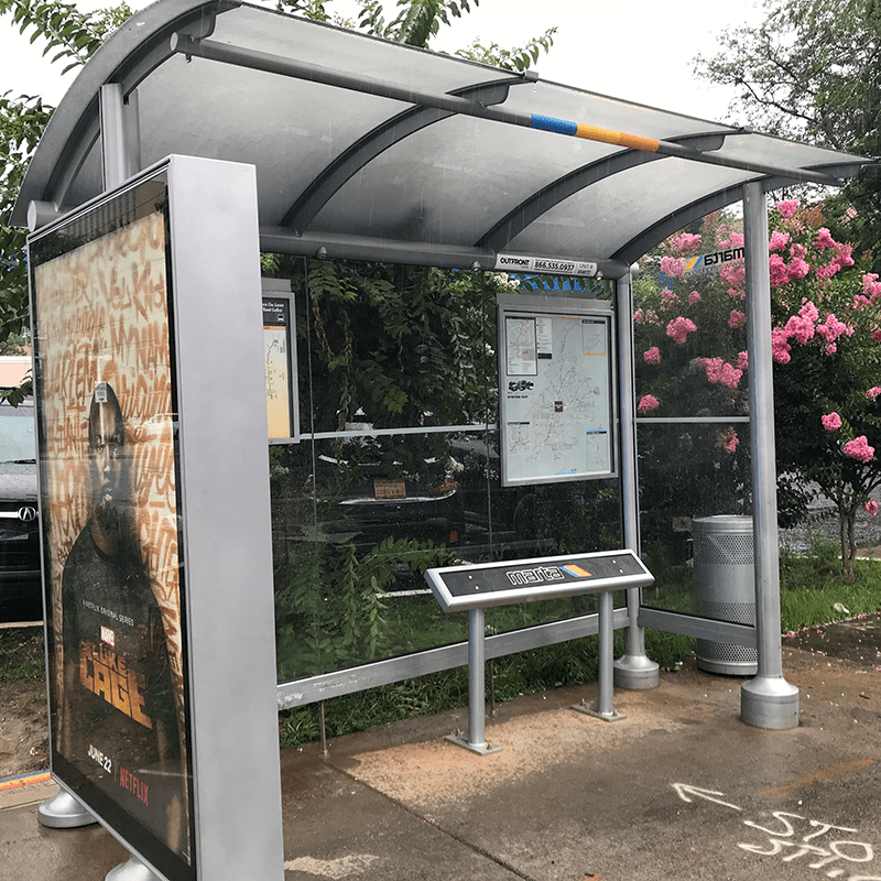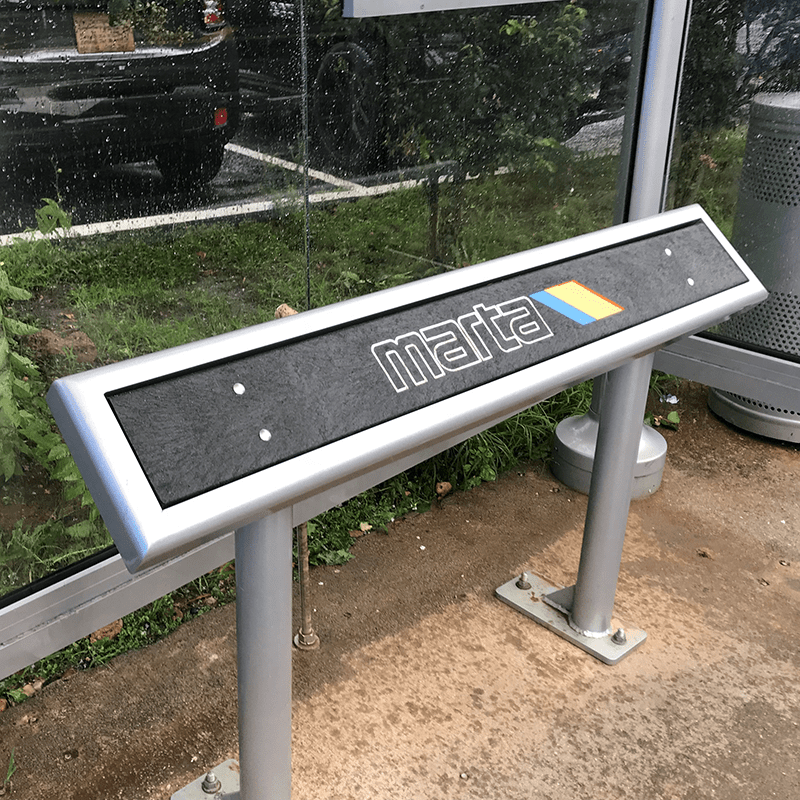 Perch benches are great solutions for providing shelter seating. Shown includes an all aluminum frame with supports and recycled high-density polyethylene (HDPE) plastic slats paired with our standard mesa recycle slat bench.