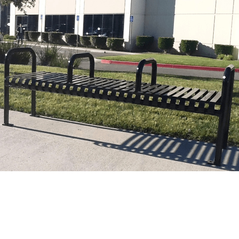 6′ Steel strap bench with no back and two seat delineators. Also available in 4′ and 8′ lengths.