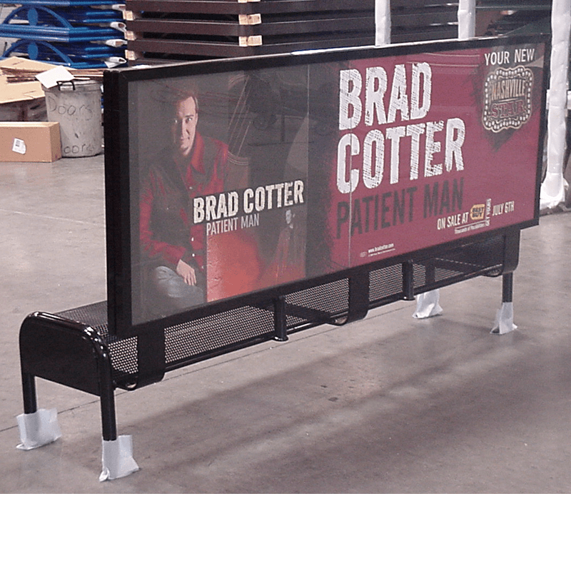 7′ perforated metal bench with tamper resistant ad frame and seat delineators. Also available with double back optional 6′ length
