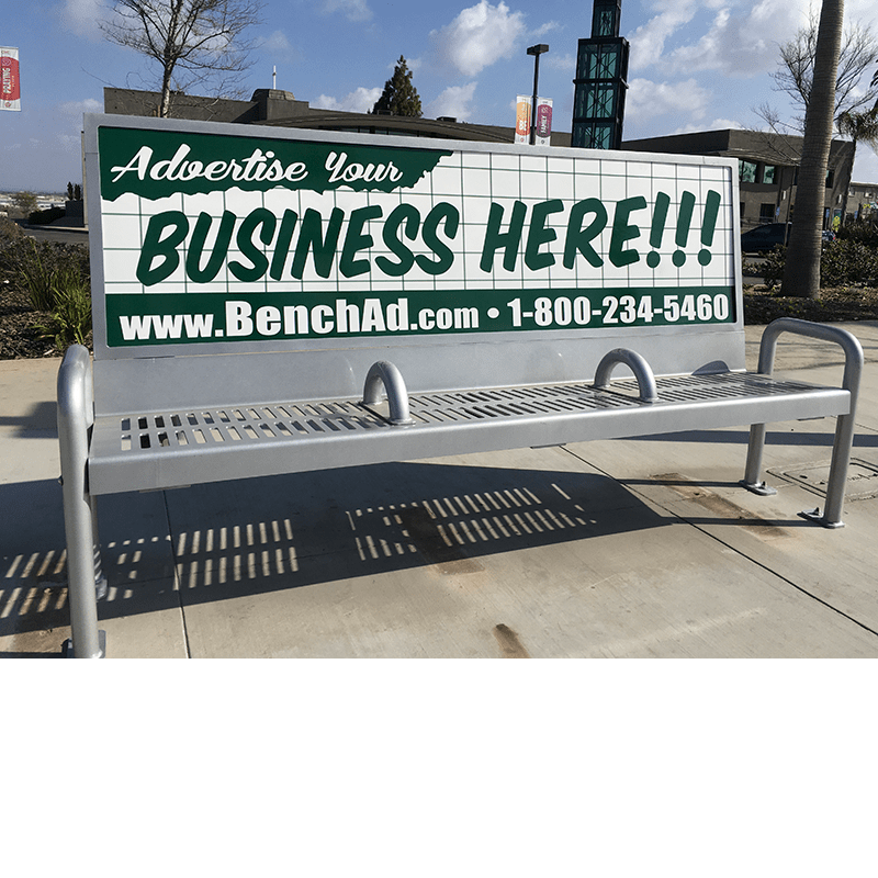 7’ Steel Advertising Bench with laser cut seat, framed ad back platform, two seat delineators