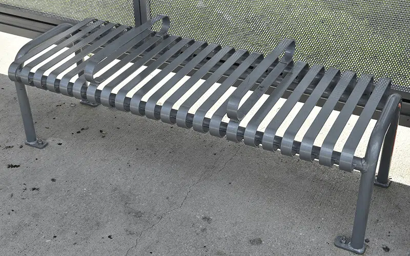 Five Foot Steel Strap Bench in Jacksonville, Florida provides comfortable seating at bus shelters across the U.S.A.